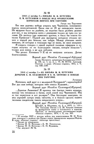 1812 г. октября 7. — Из письма М.И. Кутузова дочерям Е.М. Кудашевой и Е.М. Хитрово о победе при Тарутине. Леташевка // ЦГАДА, ф. Юсуповых, оп. 2, д. 4593, лл. 133-134. Автограф. Опублик. со значительными отклонениями в журн. «Русская старина», 1874, т. X, стр. 369.