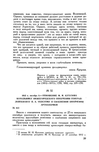 1812 г. октября 8. — Отношение М.И. Кутузова начальнику Нижегородского ополчения генерал-лейтенанту П.А. Толстому о снабжении ополчения артиллерией // ЦГВИА, оп. 291 (11а), св. 68 (281), д. 15, ч. 1, лл. 109-110. Копия. Опублик. в сб. «Труды МО ИРВИО», т. 2, М., 1912, стр. 90-91.