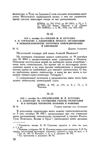 1812 г. октября 10. — Письмо М.И. Кутузова А.И. Горчакову с одобрением проекта организации в Нижнем-Новгороде заготовки обмундирования и амуниции. Деревня Леташевка // ЦГВИА, ф. 103, оп. 210, св. 8, д. 13, л. 2. Черновик.