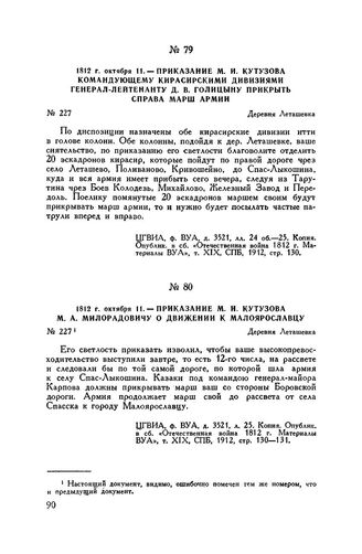 1812 г. октября 11. — Приказание М.И. Кутузова командующему кирасирскими дивизиями генерал-лейтенанту Д.В. Голицыну прикрыть справа марш армии. Деревня Леташевка // ЦГВИА, ф. ВУА, д. 3521, лл. 24об.-25. Копия. Опублик. в сб. «Отечественная война 1812 г. Материалы ВУА», т. XIX, СПБ, 1912, стр. 130.