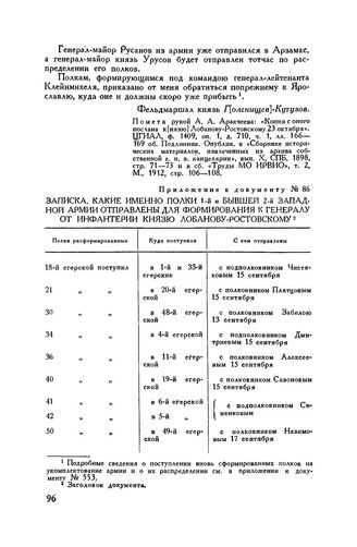 Приложение к рапорту М.И. Кутузова Александру I. Записка, какие именно полки 1-й и бывшей 2-й Западной армии отправлены для формирования к генералу от инфантерии князю Лобанову-Ростовскому