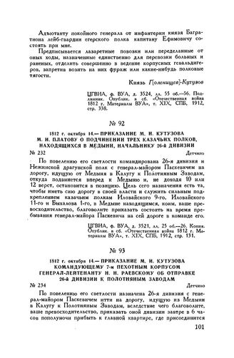 1812 г. октября 14. — Приказание М.И. Кутузова М.И. Платову о подчинении трех казачьих полков, находящихся в Медыни, начальнику 26-й дивизии. Детчино // ЦГВИА, ф. ВУА, д. 3521, лл. 25 об.-26. Копия. Опублик. в сб. «Отечественная война 1812 г. Материалы ВУА», т. XIX, СПБ, 1912, стр. 131.