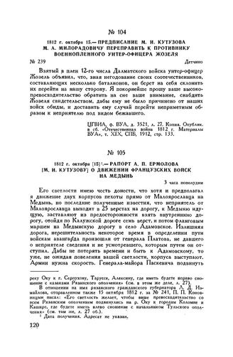 1812 г. октября 15. — Предписание М.И. Кутузова М.А. Милорадовичу переправить к противнику военнопленного унтер-офицера Жозеля. Детчино // ЦГВИА, ф. ВУА, д. 3321, л. 27. Копия. Опублик. в сб. «Отечественная война 1812 г. Материалы ВУА», т. XIX, СПБ, 1912, стр. 133.