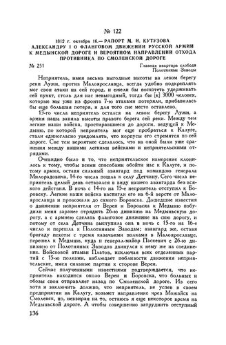 1812 г. октября 16. — Рапорт М.И. Кутузова Александру I о фланговом движении русской армии к Медынской дороге и вероятном направлении отхода противника по Смоленской дороге. Главная квартира слобода Полотняные Заводы // ЦГИАЛ, ф. 1409, оп. 1, д. 710, ч. 1, лл. 13-14. Подлинник. Опублик. в «Сборнике исторических материалов, извлеченных из архива собственной е. и. в. канцелярии», вып. X, СПБ, 1898, стр. 76-77. С небольшими отклонениями опублик. в сб. «Отечественная война 1812 г. Материалы ВУА», т. XIX, СПБ, 1912, стр. 135-136.
