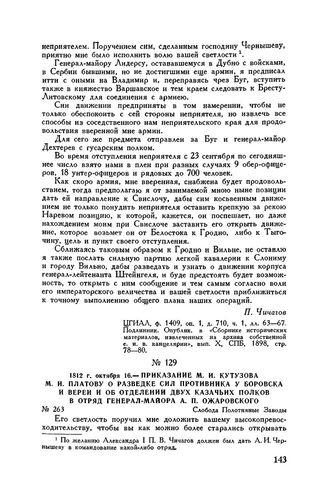 1812 г. октября 16. — Приказание М.И. Кутузова М.И. Платову о разведке сил противника у Боровска и Вереи и об отделении двух казачьих полков в отряд генерал-майора А.П. Ожаровского. Слобода Полотняные Заводы // ЦГВИА, ф. ВУА, д. 3521, л. 31 и об. Копия. Опублик. в сб. «Отечественная война 1812 г. Материалы ВУА», т. XIX, СПБ, 1912, стр. 138.