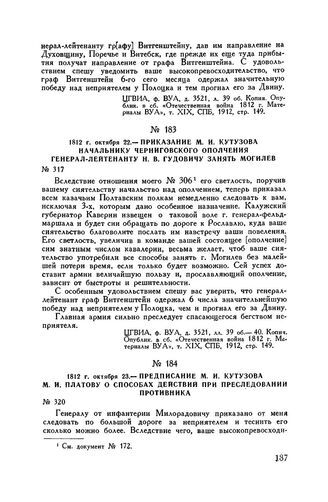 1812 г. октября 22. — Приказание М.И. Кутузова начальнику Черниговского ополчения генерал-лейтенанту Н.В. Гудовичу занять Могилев // ЦГВИА, ф. ВУА, д. 3521, лл. 39 об.-40. Копия. Опублик. в сб. «Отечественная война 1812 г. Материалы ВУА», т. XIX, СПБ, 1912, стр. 149.