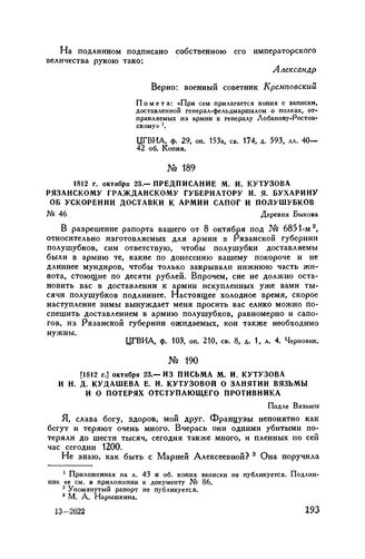 1812 г. октября 23. — Предписание М.И. Кутузова рязанскому гражданскому губернатору И.Я. Бухарину об ускорении доставки к армии сапог и полушубков. Деревня Быкова // ЦГВИА, ф. 103, оп. 210, св. 8, д. 1, л. 4. Черновик.