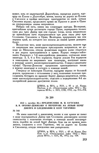 1812 г. октября 26. — Предписание М.И. Кутузова В.В. Орлову-Денисову о переправе на левый берег Днепра и следовании к селу Тарачино // ЦГВИА, ф. ВУА, д. 3521, л. 43 об. Копия. Опублик. в сб. «Отечественная война 1812 г. Материалы ВУА», т. XIX, М., 1912, стр. 154.