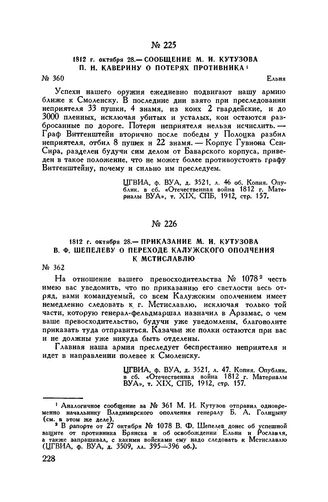 1812 г. октября 28. — Приказание М.И. Кутузова В.Ф. Шепелеву о переходе Калужского ополчения к Мстиславлю // ЦГВИА, ф. ВУА, д. 3521, л. 47. Копия. Опублик. в сб. «Отечественная война 1812 г. Материалы ВУА», т. XIX, СПБ, 1912, стр. 157.