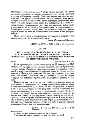 1812 г. октября 28. — Предписание М.И. Кутузова П.Н. Каверину об ускорении доставки к армии полушубков, сапог и лаптей и о разрешении выдавать их выздоровевшим раненым. Главная квартира г. Ельня