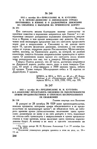 1812 г. октября 29. — Предписание М.И. Кутузова В.С. Ланскому представить сведения об обеспеченности армии продовольствием и способах бесперебойного ее снабжения. Главная квартира село Балтутино
