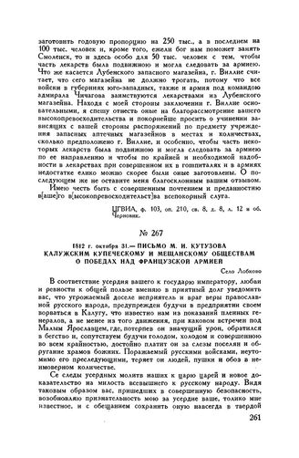 1812 г. октября 31. — Письмо М.И. Кутузова калужским купеческому и мещанскому обществам о победах над французской армией. Село Лобково