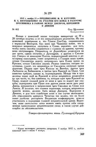 1812 г. ноября 2. — Предписание М.И. Кутузова П.X. Витгенштейну об участии его войск в разгроме противника в районе между Днепром, Березиной и Двиной. Село Щелканово // ЦГВИА, ф. ВУА, д. 3515, лл. 258-259. Подлинник. Опублик. в сб. «Отечественная война 1812 г. Материалы ВУА», т. XIX, СПБ, 1912, стр. 165-166 с копии, хранящейся в ЦГВИА, ф. ВУА, д. 3521, лл. 54 об.-55 об.