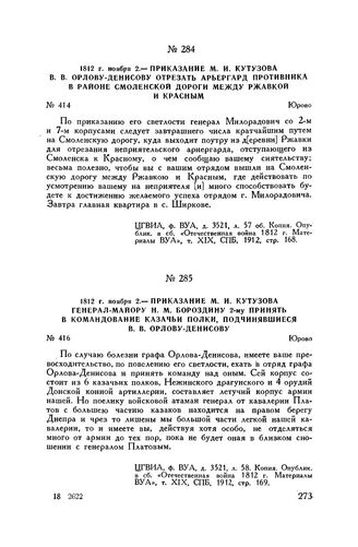1812 г. ноября 2. — Приказание М.И. Кутузова генерал-майору Н.М. Бороздину 2-му принять в командование казачьи полки, подчинявшиеся В.В. Орлову-Денисову. Юрово