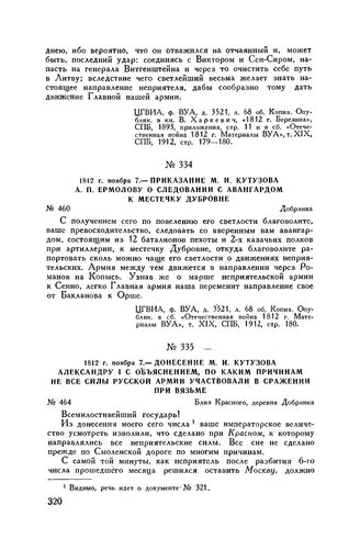 1812 г. ноября 7. — Приказание М.И. Кутузова А.П. Ермолову о следовании с авангардом к местечку Дубровне. Добрянка