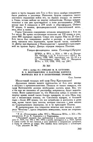 1812 г. ноября 10. — Письмо М.И. Кутузова П.X. Витгенштейну о разгроме корпуса маршала Нея и о захваченных трофеях. Село Ланенка