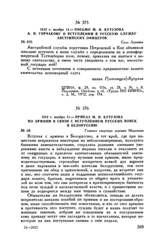 1812 г. ноября 11. — Письмо М.И. Кутузова А.И. Горчакову о вступлении в русскую службу австрийских офицеров. Село Ланенка // ЦГВИА, ф. 29, оп. 153а, св. 28, ч. 36, л. 8. Подлинник. Опублик. в сб. «Труды МО ИРВИО», т. 2, М., 1912, стр. 174.