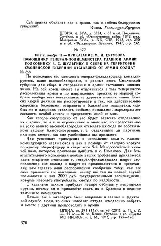 1812 г. ноября 11. — Приказание М.И. Кутузова помощнику генерал-полицмейстера Главной армии полковнику А.С. Шульгину о сборе на территории Смоленской губернии отставших от армии солдат