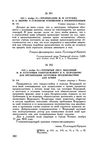 1812 г. ноября 13. — Открытый лист, выданный М.И. Кутузовым генерал-майору В.К. Безродному для организации заготовки продовольствия для армии. Главная квартира г. Копысь
