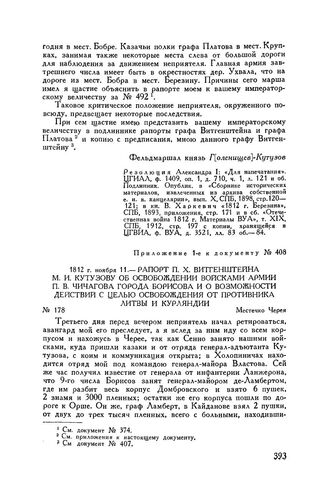 Приложение 1 к рапорту М.И. Кутузова Александру I. 1812 г. ноября 11. — Рапорт П.X. Витгенштейна М.И. Кутузову об освобождении войсками армии П.В. Чичагова города Борисова и о возможности действий с целью освобождения от противника Литвы и Курляндии. Местечко Черея // ЦГИАЛ, ф. 1409, оп. 1, д. 710, ч. 1, лл. 122-123. Копия. Опублик. в «Сборнике исторических материалов, извлеченных из архива собственной е. и. в. канцелярии», вып. X, СПБ, 1898, стр. 121-122.