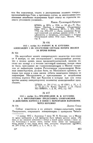 1812 г. ноября 16. — Предписание М.И. Кутузова П.X. Витгенштейну представить соображения о действиях корпуса в связи с переправой Наполеона через Березину. Деревня Сомры // ЦГВИА, ф. ВУА, д. 3514, л. 589. Подлинник. Опублик. в сб. «Отечественная война 1812 г. Материалы ВУА», т. XX, СПБ, 1912, стр. 254.