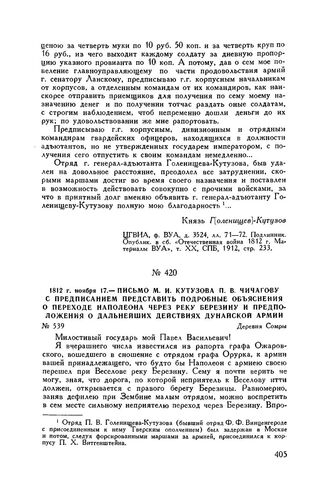 1812 г. ноября 17. — Письмо М.И. Кутузова П.В. Чичагову с предписанием представить подробные объяснения о переходе Наполеона через реку Березину и предположения о дальнейших действиях Дунайской армии. Деревня Сомры