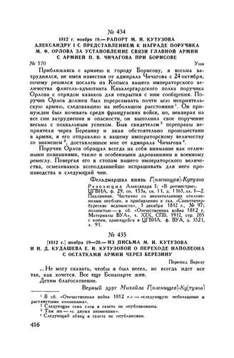 1812 г. ноября 19. — Рапорт М.И. Кутузова Александру I с представлением к награде поручика М.Ф. Орлова за установление связи Главной армии с армией П.В. Чичагова при Борисове. Уша // ЦГВИА, Ф. 29, оп. 153а, св. 11, д. 1163, лл. 1-2. Подлинник. Частично со значительными отклонениями опублик. в прибавлении к газ. «Санктпетербургские ведомости», 3 декабря 1812 г., № 97; полностью — в сб. «Отечественная война 1812 г. Материалы ВУА», т. XIX, СПБ, 1912, стр. 205 с копии, хранящейся в ЦГВИА, ф. ВУА, д. 3521, л. 91.