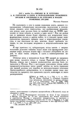 1812 г. ноября 21. — Письмо М.И. Кутузова А.И. Горчакову о сборе и использовании трофейного оружия и амуниции и об отправке в Москву трофейных орудий. Местечко Раваничи // ЦГИАЛ, ф. 1409, оп. 1, д. 710, ч. 1, лл. 133-134 об. Копия. Опублик. в «Сборнике исторических материалов, извлеченных из архива собственной е. и. в. канцелярии», вып. X, СПБ, 1893, стр. 127-128 и в сб. «Труды МО ИРВИО», т. 2, M., 1912, стр. 198-199.