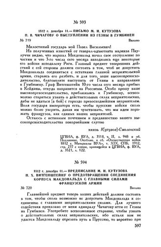 1812 г. декабря 11. — Письмо М.И. Кутузова П.В. Чичагову о выступлении из Гезны в Гумбинен. Вильно // ЦГВИА, ф. ВУА, д. 3518, ч. II, л. 948 и об. Подлинник. Опублик. в сб. «Отечественная война 1812 г. Материалы ВУА», т. XIX, СПБ, 1912, стр. 237 с копии, хранящейся в ЦГВИА, ф. ВУА, д. 3521, л. 122.