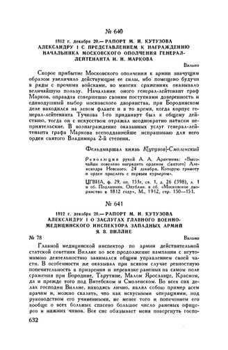 1812 г. декабря 20. — Рапорт М.И. Кутузова Александру I с представлением к награждению начальника Московского ополчения генерал-лейтенанта И.И. Маркова. Вильно // ЦГВИА, ф. 29, оп. 153г, св. 1, д. 26 (398), л. 1 и об. Подлинник. Опублик. в сб. «Московское дворянство в 1812 году», М., 1912, стр. 150-151.