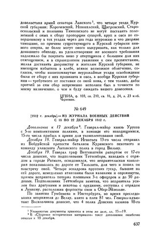 1812 г. декабрь. — Из журнала военных действий с 18 по 22 декабря 1812 г. // ЦГИАЛ, ф. 1409, оп. 1, д. 649, лл. 152-156 об. Подлинник. Опублик. в прибавлении к газ. «Санктпетербургские ведомости», 27 декабря 1812 г., № 104 и в «Сборнике исторических материалов, извлеченных из архива собственной е. и. в. канцелярии», вып. XIII, СПБ, 1906, стр. 84-86.