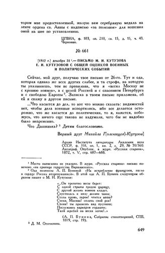 1812 г. декабря 31. Письмо М.И. Кутузова Е.И. Кутузовой с общей оценкой военных и политических событий // Архив Института литературы Академии наук СССР, ф. 358, оп. 1, кн. 2, л. 29, № 70/360. Автограф. Опублик. в журн. «Русская старина», 1872, т. V, стр. 687-688.