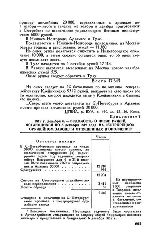 1812 г. декабря 6. — Ведомость о числе ружей, остающихся по 5 декабря 1812 года на Сестрорецком оружейном заводе и отпущенных в ополчение // ЦГВИА, ф. 1/л, оп. 1, д. 2733, лл. 66-67 об. Подлинник.
