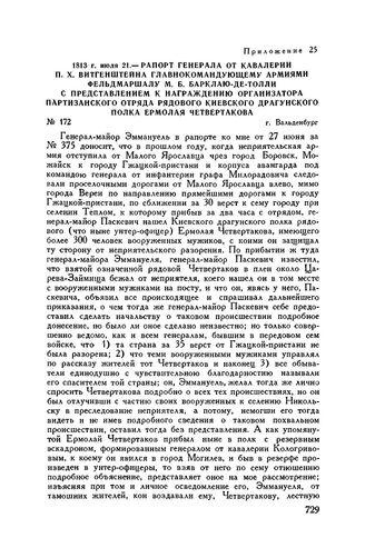 1813 г. июля 21. — Рапорт генерала от кавалерии П.X. Витгенштейна главнокомандующему армиями фельдмаршалу М.Б. Барклаю-де-Толли с представлением к награждению организатора партизанского отряда рядового Киевского драгунского полка Ермолая Четвертакова. г. Вальденбург // ЦГВИА, ф. 103, оп. 208а, св. 0, д. 27, ч. 2, лл. 192 и об., 193 и об. Подлинник.
