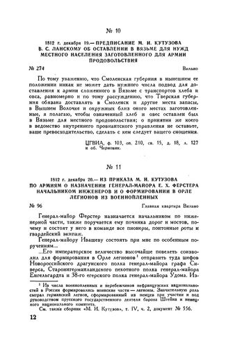 1812 г. декабря 20. — Из приказа М.И. Кутузова по армиям о назначении генерал-майора Е.X. Ферстера начальником инженеров и о формировании в Орле легионов из военнопленных. Главная квартира Вильно // ЦГВИА, ф. ВУА, д. 3524, лл. 92-93. Подлинник.