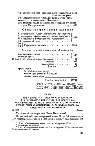 1812 г. декабря 24. — Письмо М.И. Кутузова П.В. Чичагову о поручении П.К. Эссену 3-му формирования войск в Бобруйске и о назначении отряду генерал-лейтенанта Д.М. Волконского 3-го следовать к Брест-Литовску. Вильно // ЦГВИА, ф. ВУА, д. 3843, л. 28. Подлинник. Опублик. в сб. «Отечественная война 1812 г. Материалы ВУА», т. XIX, СПБ, 1912, стр. 253 и в сб. «Война 1813 года», т. II, Петроград, 1916, стр. 6-7.