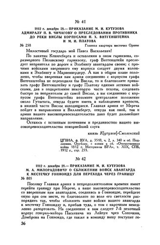 1812 г. декабря 28. — Приказание М.И. Кутузова М.А. Милорадовичу о сближении войск авангарда к местечку Гониондз для перехода через границу // ЦГВИА, ф. ВУА, д. 3521, л. 139 и об. Копия. Опублик. в сб. «Отечественная война 1812 г. Материалы ВУА», т. XIX, СПБ, 1912, стр. 255.