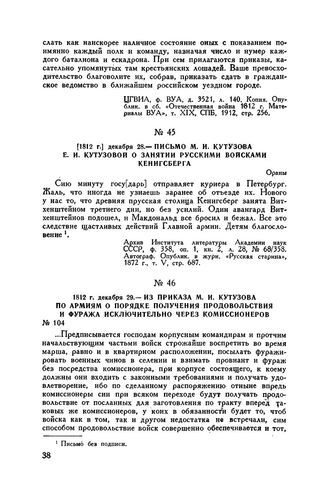 1812 г. декабря 28. — Письмо М.И. Кутузова Е.И. Кутузовой о занятии русскими войсками Кенигсберга. Ораны // Архив Института литературы Академии наук СССР, ф. 358, оп. 1, кн. 2, л. 28, № 68/358. Автограф. Опублик. в журн. «Русская старина», 1872 г., т. V, стр. 687.