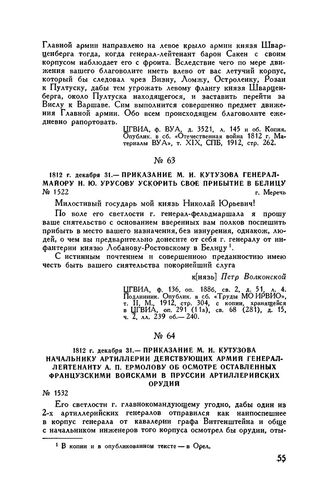 1812 г. декабря 31. — Приказание М.И. Кутузова генерал-майору Н.Ю. Урусову ускорить свое прибытие в Белицу. г. Меречь // ЦГВИА, ф. 136, оп. 1886, св. 2, д. 51, л. 4. Подлинник. Опублик. в сб. «Труды МО ИРВИО», т. II, М., 1912, стр. 304, с копии, хранящейся в ЦГВИА, оп. 291 (11а), св. 68 (281), д. 15, ч. 2, лл. 239 об.-240.