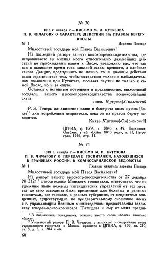1813 г. января 2. — Письмо М.И. Кутузова П.В. Чичагову о характере действий на правом берегу Вислы. Деревня Посовце // ЦГВИА, ф. ВУА, д. 3843, л. 49. Подлинник. Опублик. в сб. «Война 1813 года», т. II, Петроград, 1916, стр. 11.