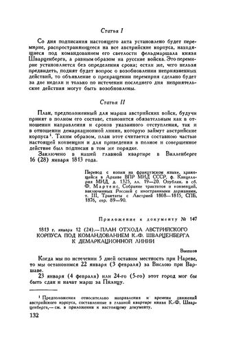Приложение к проекту конвенции о перемирии между русскими и австрийскими войсками. 1813 г. января 12 (24). — План отхода австрийского корпуса под командованием К.-Ф. Шварценберга к демаркационной линии. Вышков // Перевод с копии на немецком языке, хранящейся в Архиве ВПР МИД СССР, ф. Канцелярия МИД, д. 1323, л. 18 и об. Опублик. там же, стр. 90-91.