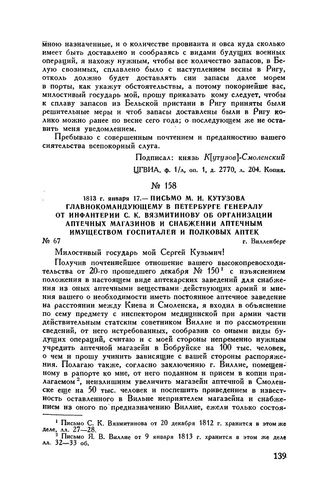 1813 г. января 17. — Письмо М.И. Кутузова главнокомандующему в Петербурге генералу от инфантерии С.К. Вязмитинову об организации аптечных магазинов и снабжении аптечным имуществом госпиталей и полковых аптек. г. Вилленберг