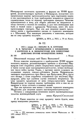 1813 г. января 20. — Письмо М.И. Кутузова П.В. Чичагову с предписанием о соединении с корпусом Ф.Ф. Винценгероде для совместных действий против французских войск. г. Млава // ЦГВИА, ф. ВУА, д. 3843, л. 152. Подлинник. Опублик. в сб. «Война 1813 года», т. II, Петроград, 1916, стр. 36-37.