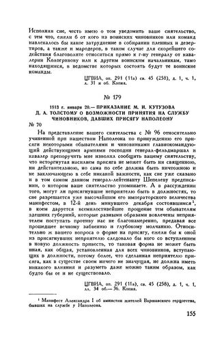 1813 г. января 20. — Приказание М.И. Кутузова Д.А. Толстому о возможности принятия на службу чиновников, давших присягу Наполеону // ЦГВИА, оп. 291 (11а), св. 45 (258), д. 1, ч. 1, лл. 34 об.-36. Копия.