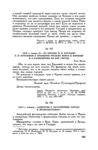 1813 г. января 24. — Из письма М.И. Кутузова Е.И. Кутузовой о прибытии русских войск к Варшаве и о размещении их вне города. Близ Вислы // Архив Института литературы Академии наук СССР, ф. 338, оп. 1, кн. 2, л. 34, № 79/369. Автограф. Опублик. в журн. «Русская старина», 1872, Т. V, стр. 689-690.