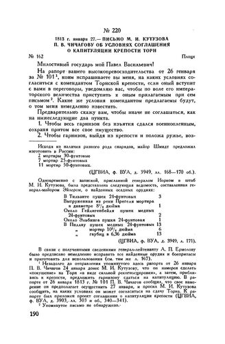 1813 г. января 27. — Письмо М.И. Кутузова П.В. Чичагову об условиях соглашения о капитуляции крепости Торн. Плоцк // ЦГВИА, ф. ВУА, д. 3949, л. 50 и об. Подлинник. Опублик. в сб. «Фельдмаршал Кутузов», 1947, стр. 262-263.