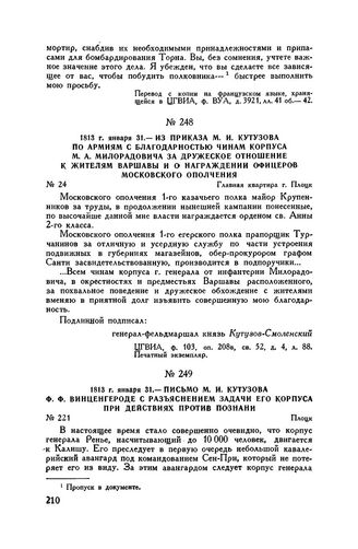 1813 г. января 31. — Из приказа М.И. Кутузова по армиям с благодарностью чинам корпуса М.А. Милорадовича за дружеское отношение к жителям Варшавы и о награждении офицеров Московского ополчения. Главная квартира г. Плоцк // ЦГВИА, ф. 103, оп. 208в, св. 52, д. 4, л. 88. Печатный экземпляр.