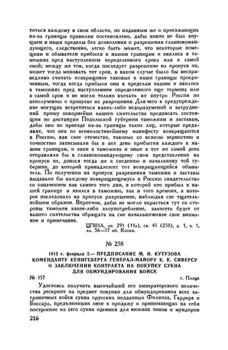 1813 г. февраля 2. — Предписание М.И. Кутузова коменданту Кенигсберга генерал-майору К.К. Сиверсу о заключении контракта на покупку сукна для обмундирования войск. г. Плоцк