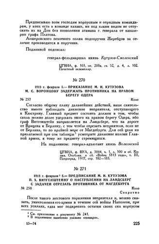 1813 г. февраля 5. — Предписание М.И. Кутузова П.X. Витгенштейну о наступлении на Ландсберг с задачей отрезать противника от Магдебурга. Коло // ЦГВИА, ф. ВУА, д. 3904, ч. 1, лл. 66-67 об. Подлинник. Частично со значительными отклонениями опублик. в кн. А.И. Михайловский-Данилевский «Описание войны 1813 года», ч. 1, СПБ, 1840, стр. 62-63.