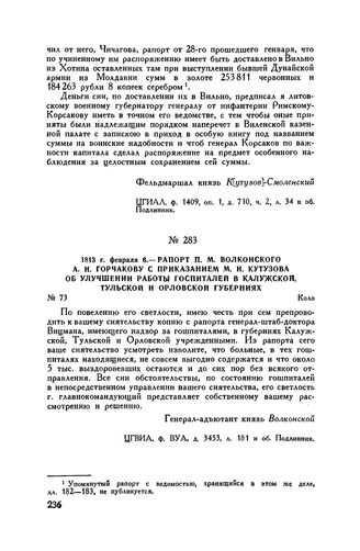 1813 г. февраля 6. — Рапорт П.М. Волконского А.И. Горчакову с приказанием М.И. Кутузова об улучшении работы госпиталей в Калужской, Тульской и Орловской губерниях. Коло // ЦГВИА, ф. ВУА, д. 3453, л. 181 и об. Подлинник.